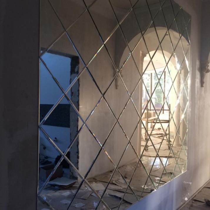 Использована квадратная серебристая зеркальная плитка размером 18х18.